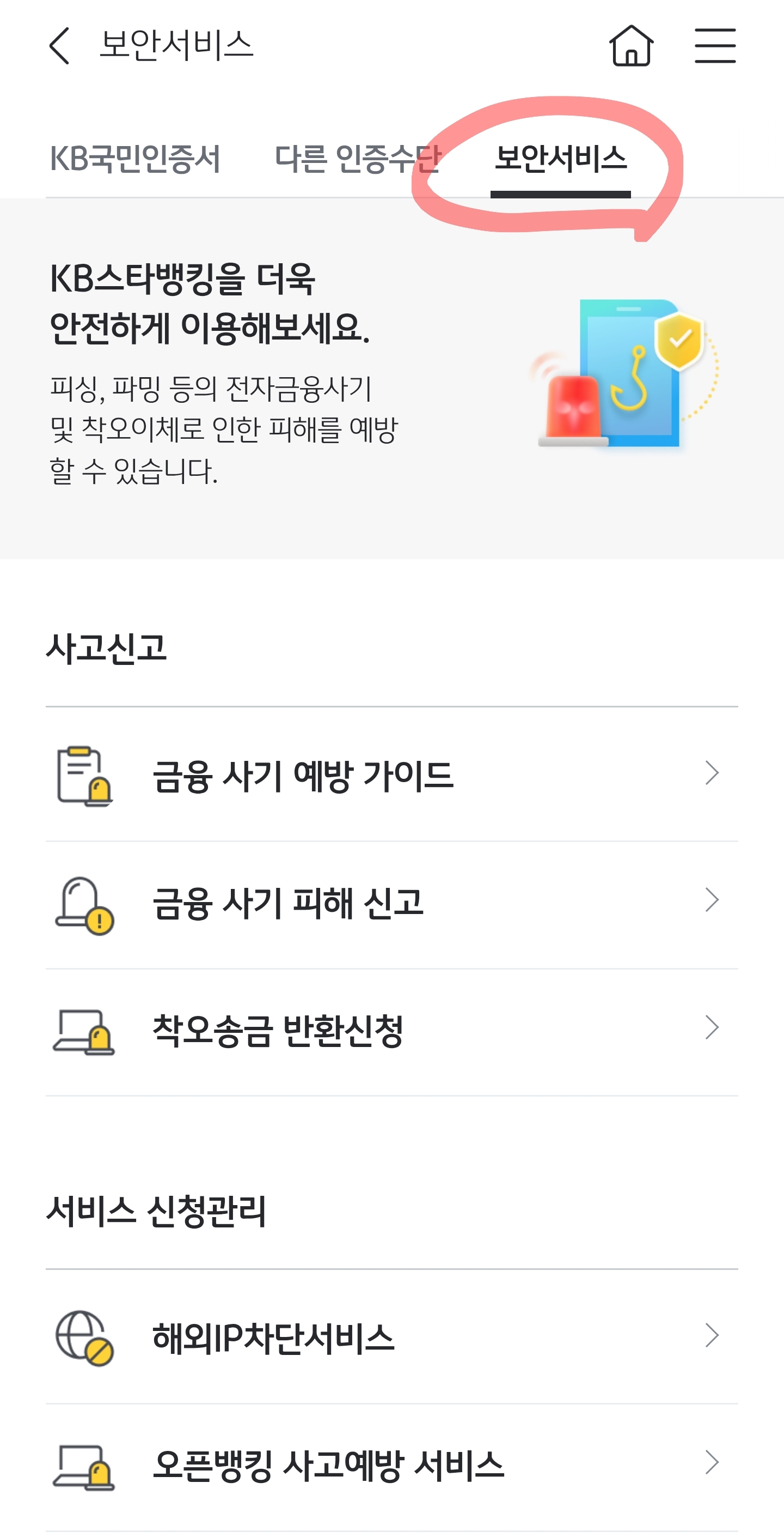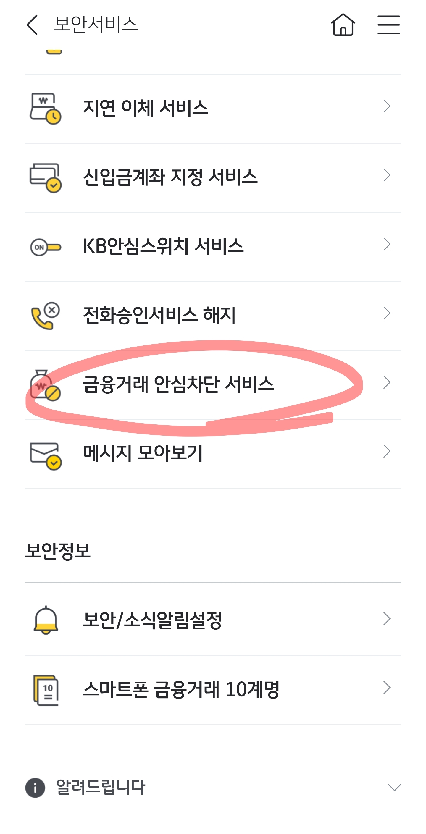 3. 보안서비스 하단에 '금융거래 안심차단 서비스' 클릭