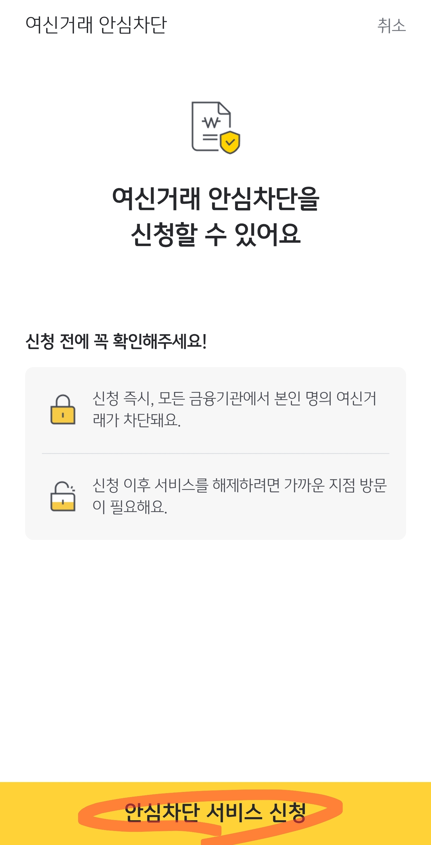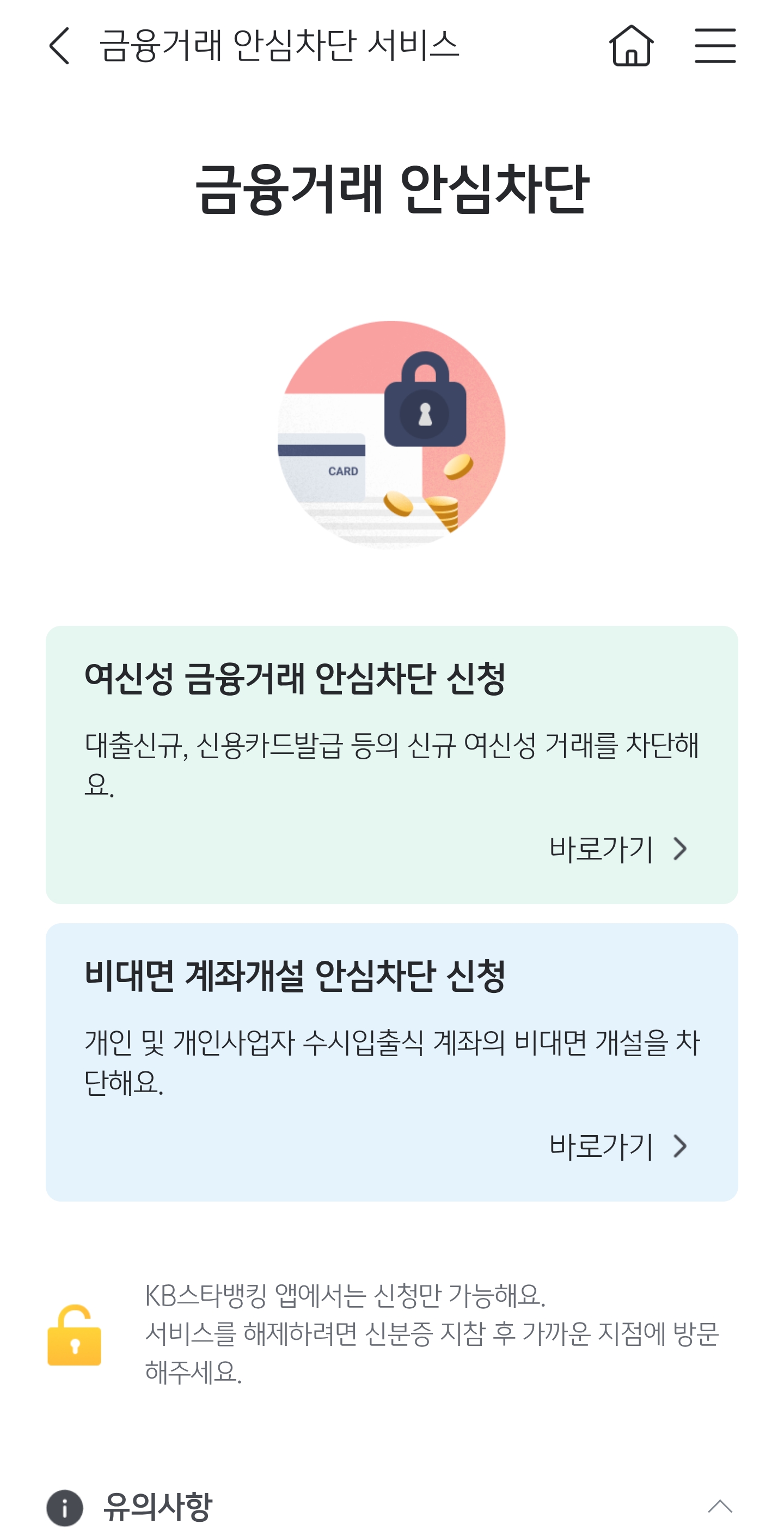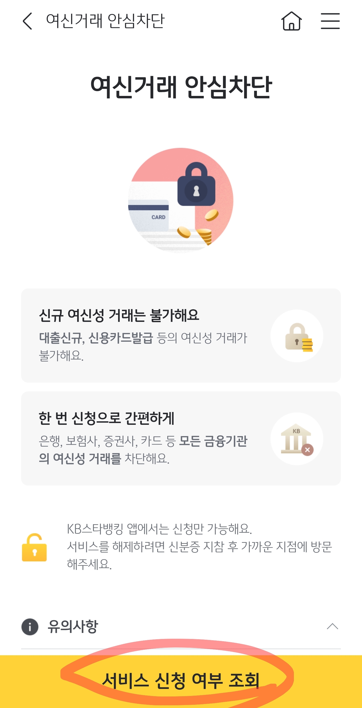 국민은행 모바일 앱로 손쉽게 여신거래안심차단서비스를 신청할 수 있습니다.