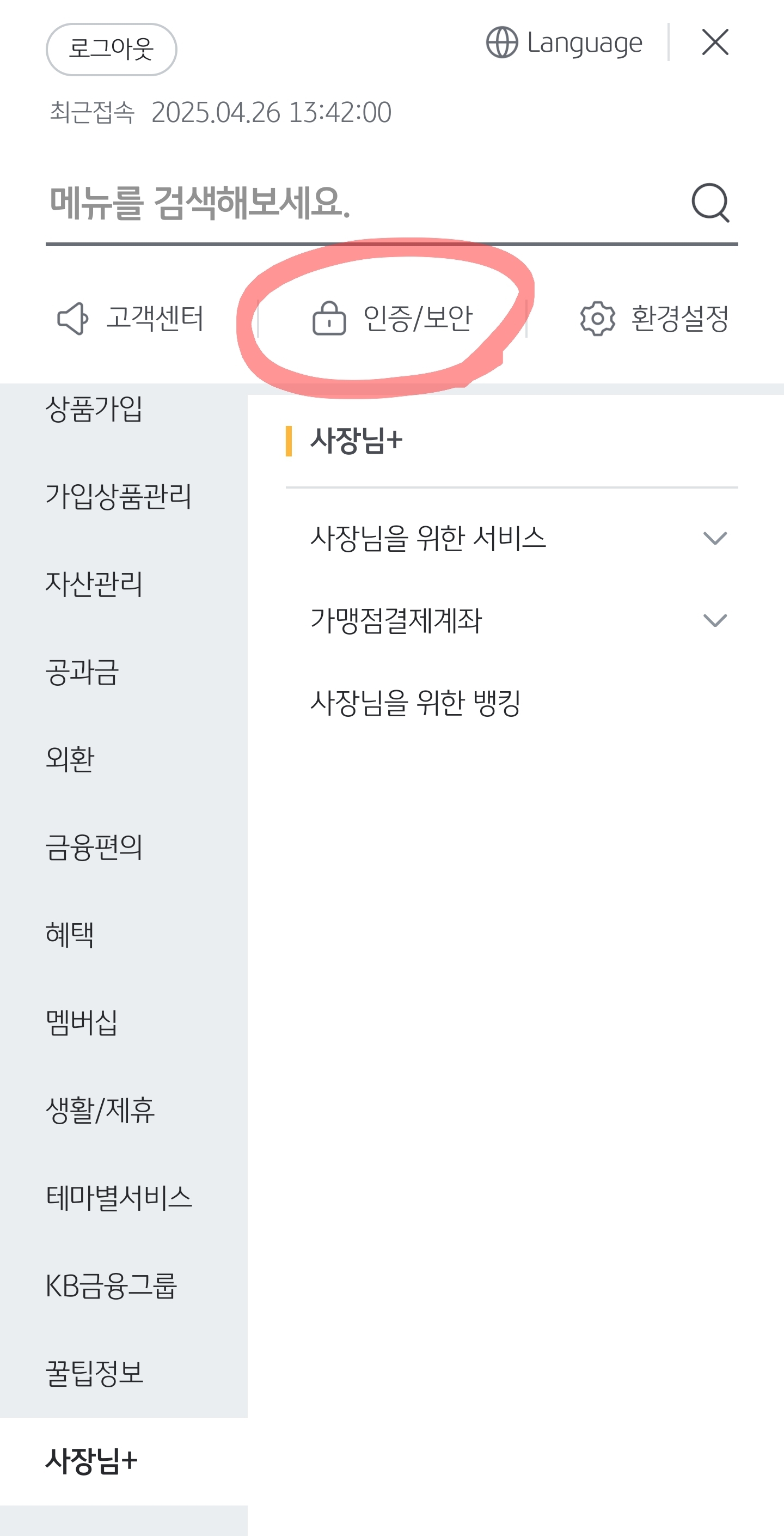 1. 모바일 앱 "KB스타뱅킹" 접속 후 전체 메뉴에서 '인증/보안' 클릭