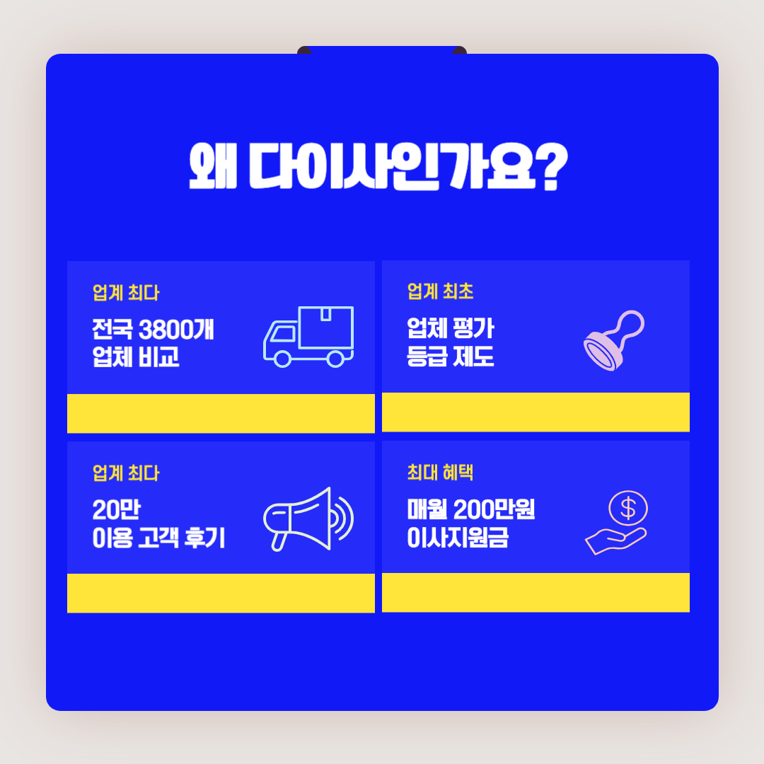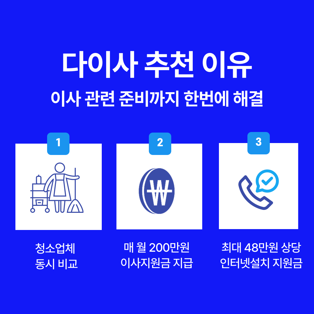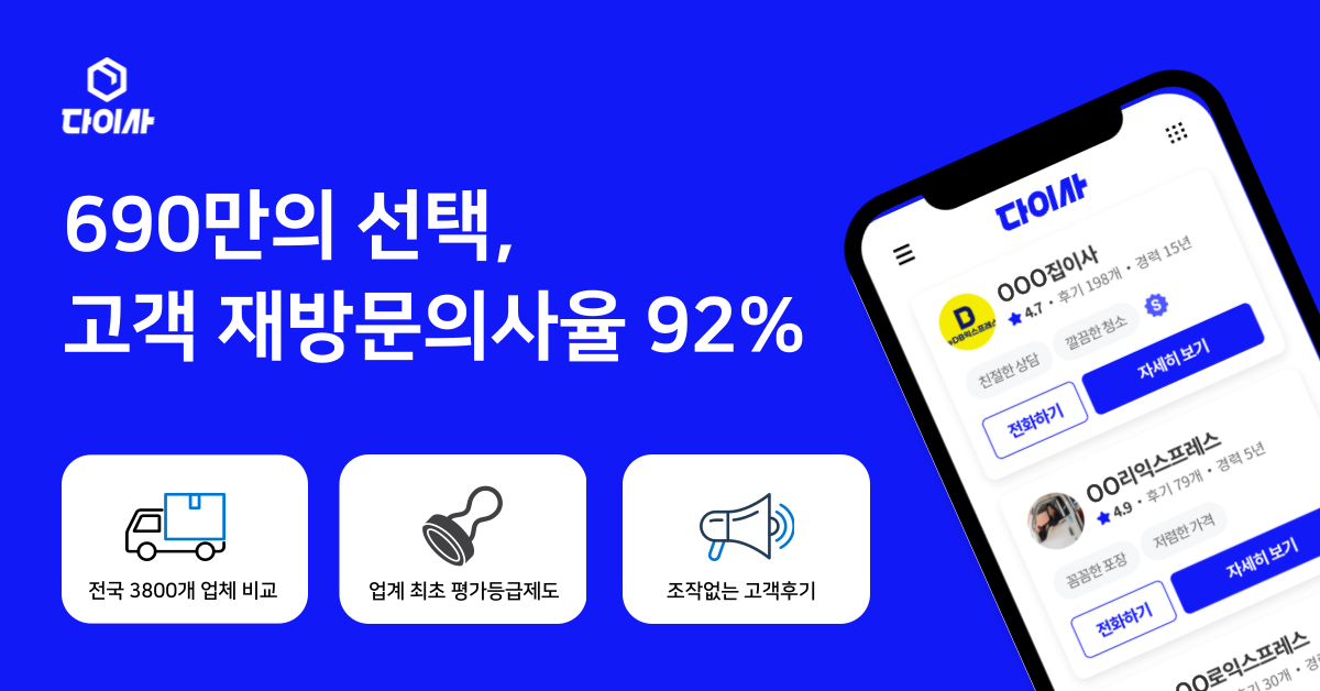 이사를 앞두고 이사업체를 찾는 데 어려움을 겪고 계시다면 고민하지 마시고 '다이사'를 이용해 보세요. 무료로 이사업체 견적비교를 제공하며 이사지원금 혜택까지 제공하고 있습니다.