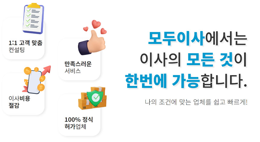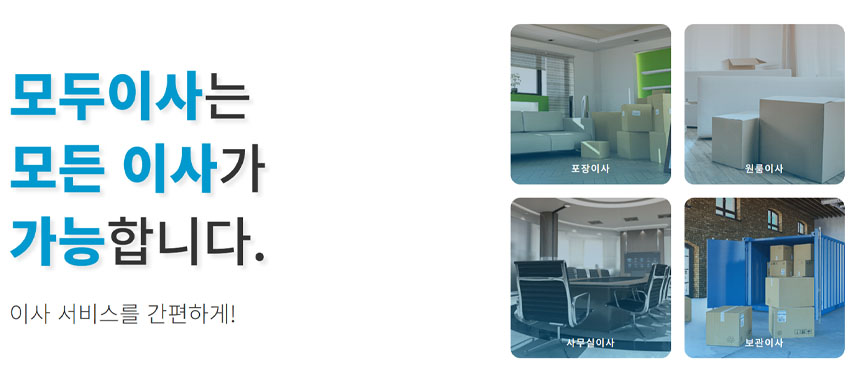 이사를 앞두고 이사업체를 찾는 데 어려움을 겪고 계신가요? 고민하지 마시고 이사업체 견적 플랫폼을 이용해 보세요. 최우수 업체들을 무료로 비교 견적을 제공해주는 '모두이사'를 추천드립니다.
