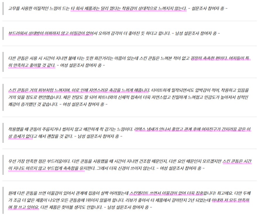아래 후기를 보면 만족도가 높은 것을 볼 수 있습니다. 특히, 부드럽고 이질감이 들지 않아 피부처럼 느껴지며 남녀모두 만족한다는 것을 알 수 있습니다. 또한 폴리아이소프렌 재질이라 흔히 타 제품 사용시 겪는 라텍스 알레르기 반응이 없습니다.